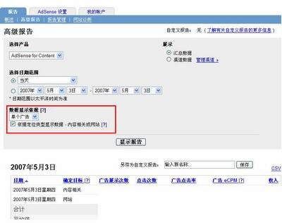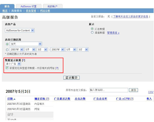 要查看您网站上在一段时间内展示的是哪一种广告,您可以在您帐户中的 “高级报告” 进行查看。选择 AdSense for content 作为产品,在 “数据显示依据” 栏选择按照"单个广告"显示数据,并选中 “依据定位类型显示数据 - 内容相关或网站”,然后点击 “显示报告”,就可以生成一个依据广告类型的报告(如图中所示)。报告中 “内容相关” 代表 CPC 广告,“网站” 代表 CPM 广告。