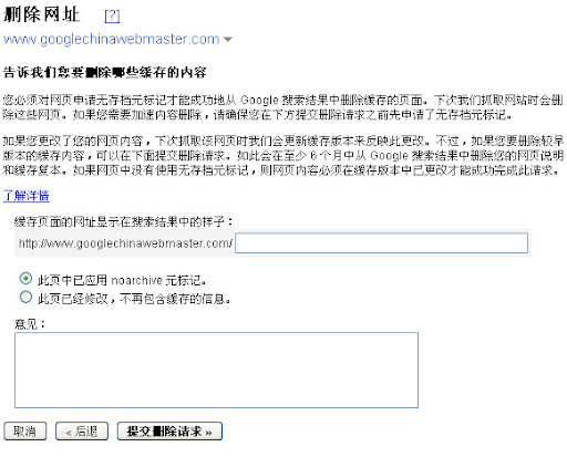 如果你的某一页面已被删除,你也不想让它的缓存版本存在于Google的索引中,你可以在工具里请求删除缓存。我们会先检查一下该页的现有内容是否真的有别于缓存版本。如果是,我们就会清除缓存版本。我们会在6个月后自动显示最新的缓存页面版本(6个月后,我们可能已经又爬行过你的页面,缓存版本会反映最新的内容),或者,如果你发现我们早于6个月重新爬行了你的页面,你可以用工具要求我们早一点重新包含缓存版本。